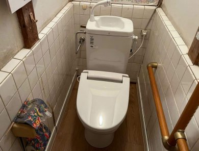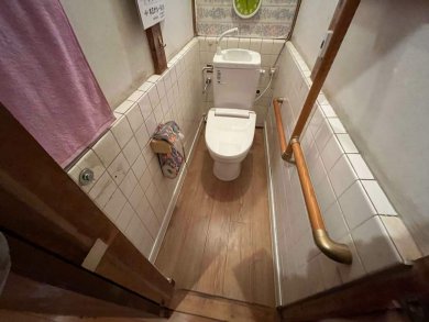 簡易水洗トイレは最近ではあまりみられなくなりました。ご夫婦お二人で、浄化槽スペースもなく、リクシルの簡易トイレを施工しました。暖房便座になり、介護用の手摺も設置し、トイレに行くのが少し楽になりました。
