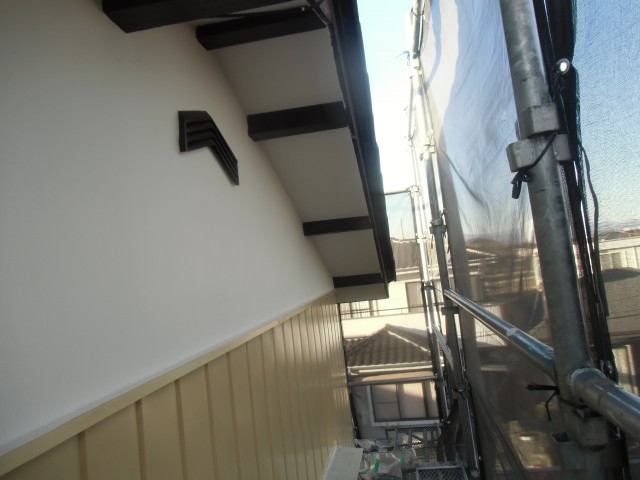 軒裏はベニヤより丈夫なケイカル板で施工後塗装、外壁はしっかり洗浄し塗装しました。